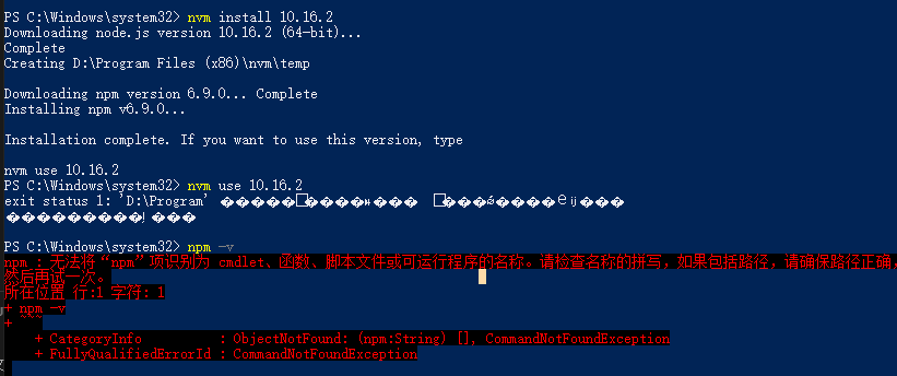 在使用nvm安装nodejs时,最好不要将nvm安装到带有空格的路径中,比如:D:\Program Files (x86)\nvm,这种不行,最后安装完node,会报一个莫名奇妙的问题。而且不能完整的安装nodejs。