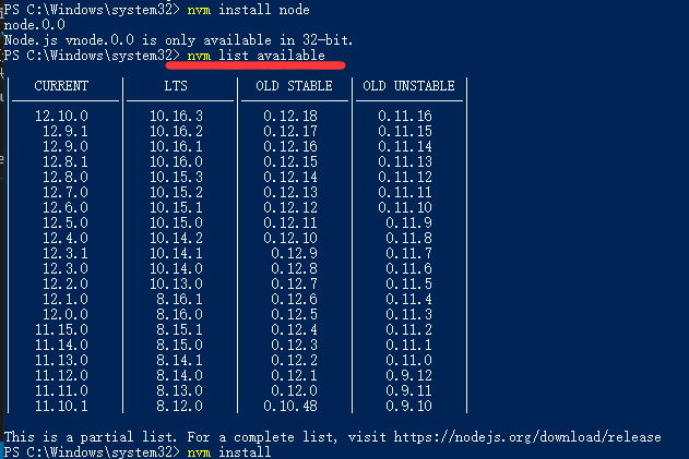 或者是使用 nvm list availiable(新版:nvm ls-remote) 查看可以安装的nodejs版本。