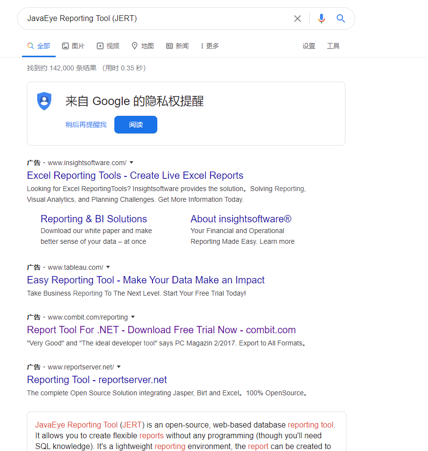 这个工具到底是什么,其实我没有找到相关的官网,唯一说明的就是上面这篇文章中的介绍。比如:JERT是一个开放源代码的,基于web的,数据库报表工具,它能够让你不需要编程而能创建各种灵活的报表。(当然你需要了解一定的SQL知识)。在谷歌上直接搜这个名字,出现了很多的广告,这是我见过的广告最多的一次。