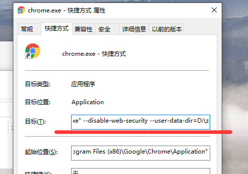 (2) 右键打开桌面chrome.exe快捷方式,然后在快捷方式的exe后面,添加空格,并添加 –disable-web-security –user-data-dir=D:\ss 参数,其中,ss为本地文件夹。