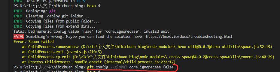 同时出现了:fatal: bad numeric config value ‘fase’ for ‘core.ignorecase’: invalid unit