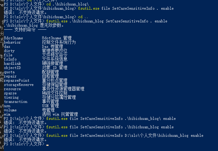 使用: fsutil.exe file SetCaseSensitiveInfo . enable 命令,结果出现错误,不支持该请求