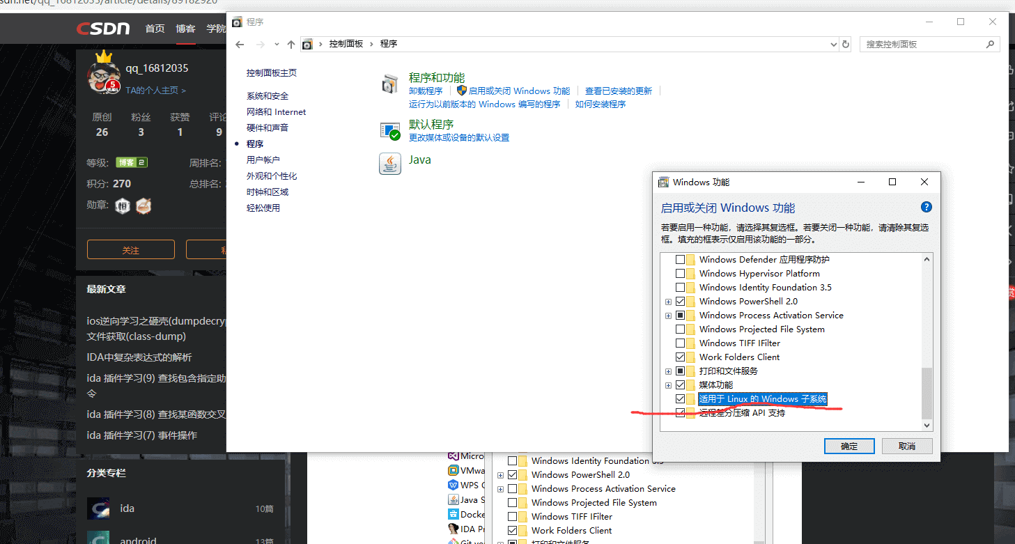 最后我在控制面板中->程序->打开或关闭window程序中,打开了:适用于于Linux的Windows子系统 功能。