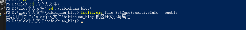 然后重启电脑,更新,再次进入到相关目录,运行: fsutil.exe file SetCaseSensitiveInfo . enable 结果还是真是好了。
