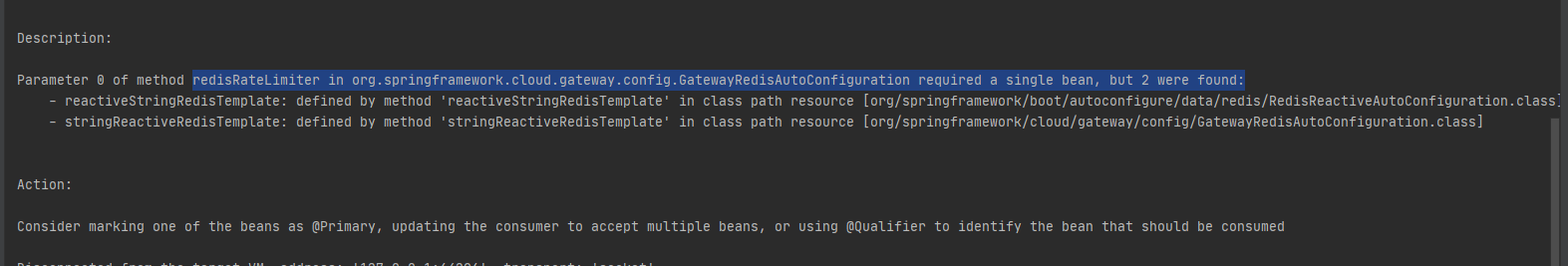 (2) redisRateLimiter in org.springframework.cloud.gateway.config.GatewayRedisAutoConfiguration required a single bean, but 2 were found: