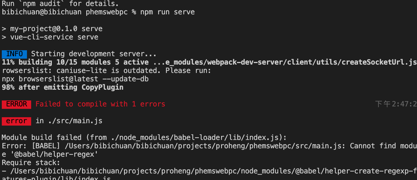 但是我执行了安装@babel/helper-regex的命令之后,再次运行 npm run,还是出现模块不存在的问题。