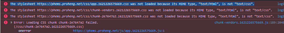 8.The stylesheet https://phems.proheng.net/css/app.1621226575669.css was not loaded because its MIME type, “text/html”, is not “text/css”