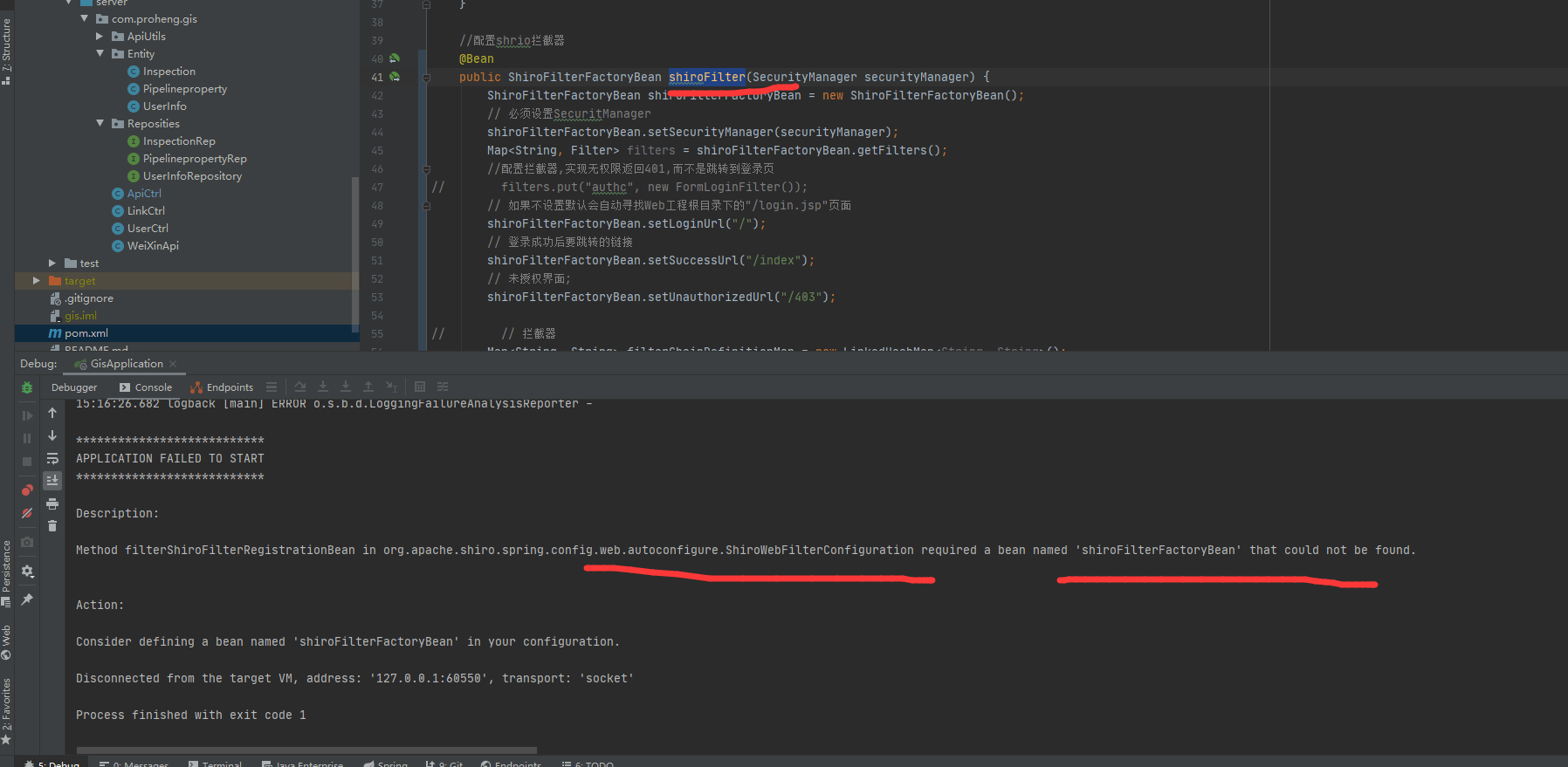 注意 过滤器的名字不能是shiroFilter而必须是shiroFilterFactoryBean,否则启动的时候就会报错