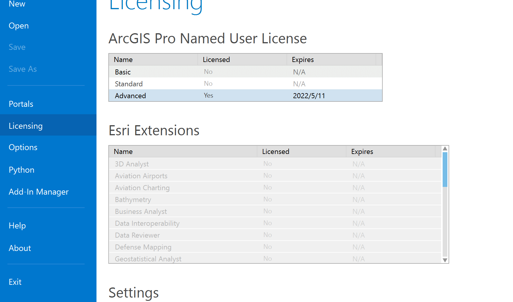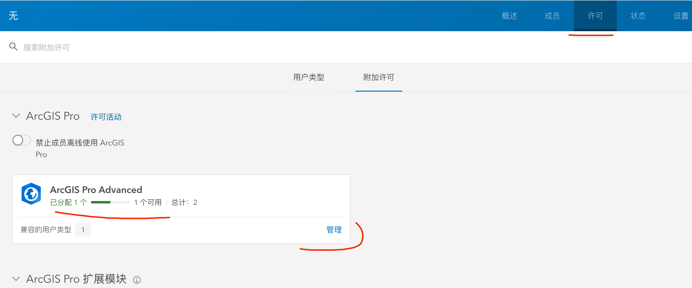在打开许可页面,在ArcGIS Pro许可处,点击管理。