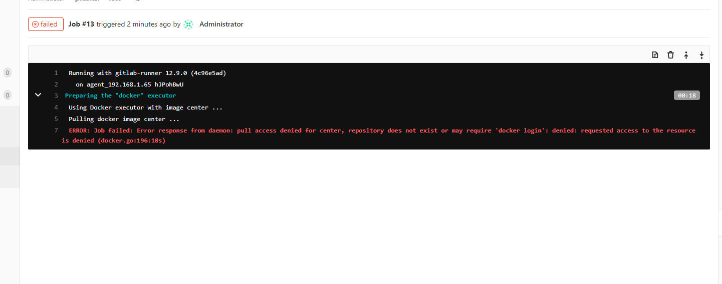 1.ERROR: Job failed: Error response from daemon: pull access denied for center, repository does not exist or may require ‘docker login’: denied: requested access to the resource is denied (docker.go:196:18s)