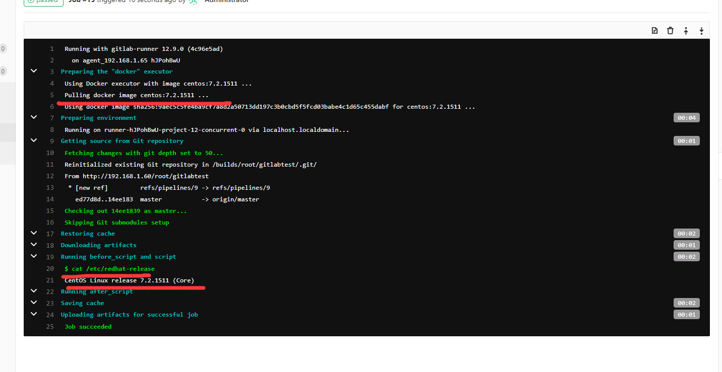 最后输出的系统版本也是: CentOS Linux release 7.2.1511 (Core) ,在安装gitlab-runner的服务器上,使用docker ls查看,也多出了一个 centos:7.2.1511 的镜像。