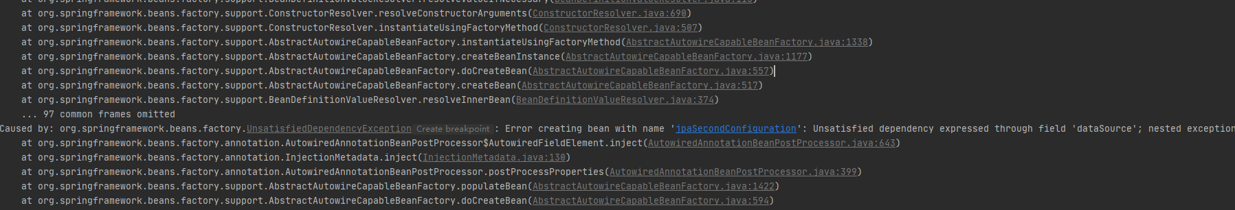 每个数据源定义了都定义了entity和respository,每次启动之后都会报错误,找不到依赖。Error creating bean with name ‘jpaSecondConfiguration’: Unsatisfied dependency expressed through field ‘dataSource’; nested e