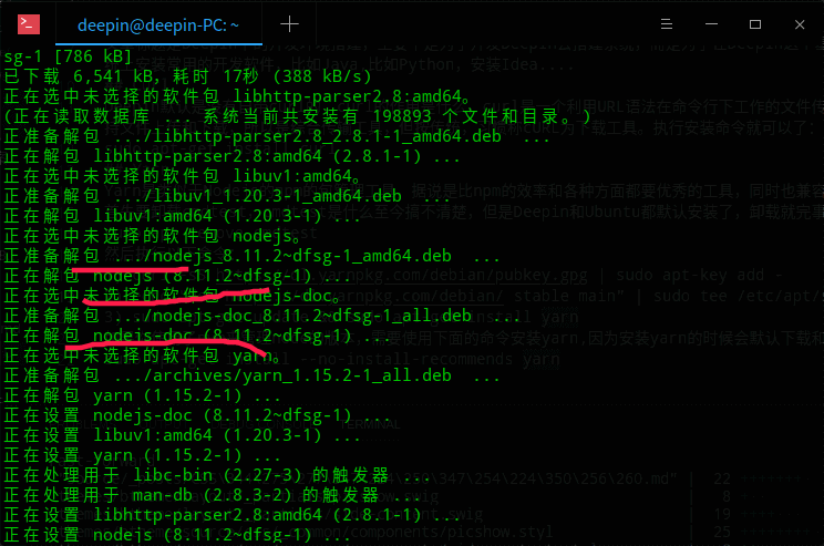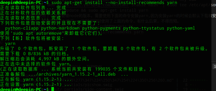 使用sudo apt-get install –no-install-recommends yarn之后