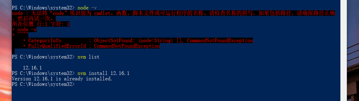 这个主要是我虽然安装完成了node,但是没有执行:nvm use 12.16.1指定使用哪个版本。执行nvm use之后,就可以了。