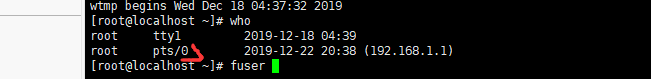 然后使用who命令查看有谁在连接:然后使用: fuser -k /dev/pts/0,将用户删掉,后面的零是用户的pts/后面的序号: