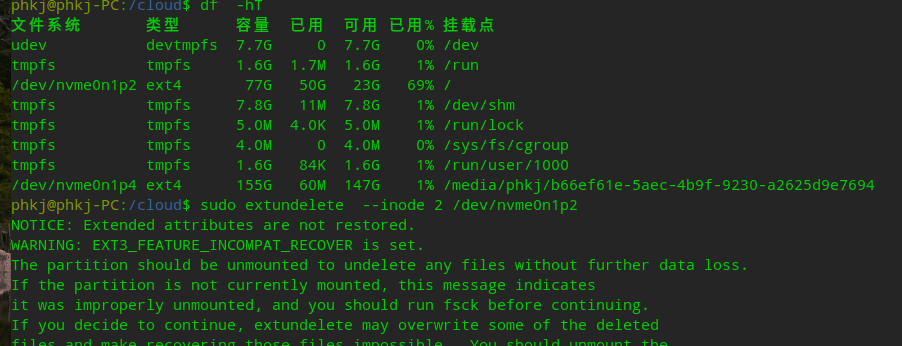 很遗憾,我并没有通过 extundelete 恢复成功过文件,主要是我使用这个文件,连文件都没有查询到,理论上就算没有相关的删除文件,但是inode总是可以查的出来的吧,但是我的查不出来。