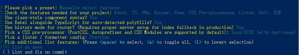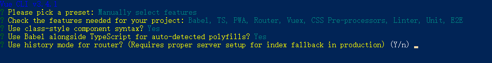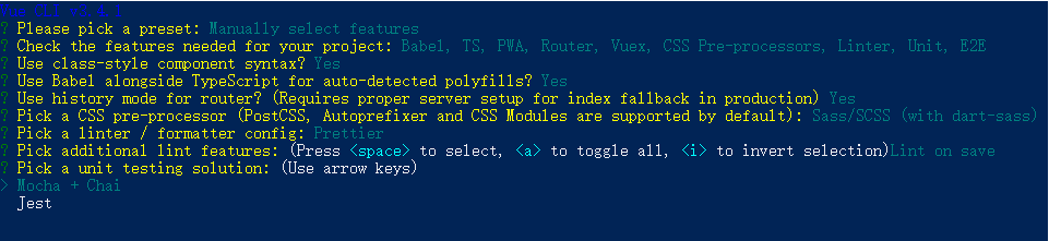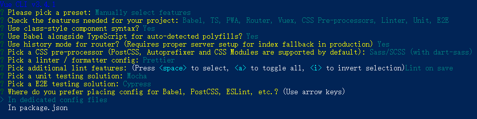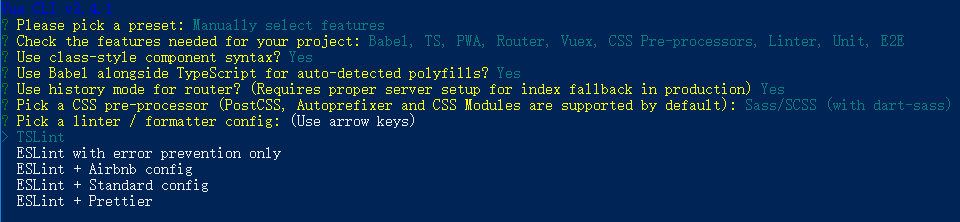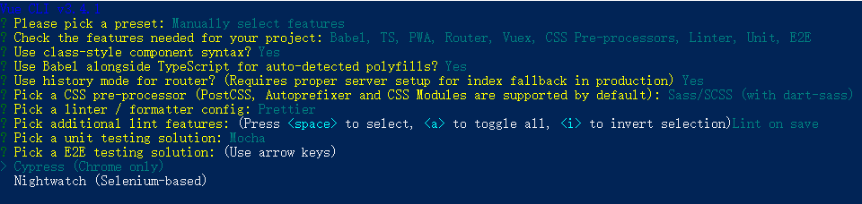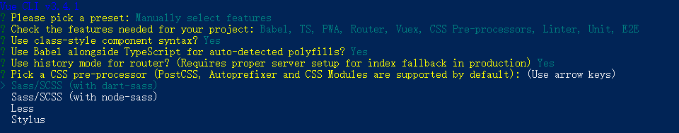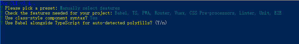 vue-cli的2.0和3.0版本差距还是挺大的。如何安装我就不写了,官网都解释的很清楚了,我这里安装的时候,选择了用yarn作为包管理工具。主要解释下在创建项目时的各种选项的含义。