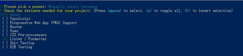 3.选择配置项,这里总共有九项配置,空格键“选中/取消选中”,确定键完成选择,上下键移动(如果使用Git Bash,上下键好像不管用。最好用PowerShell)。全选,主要看看都有些什么。