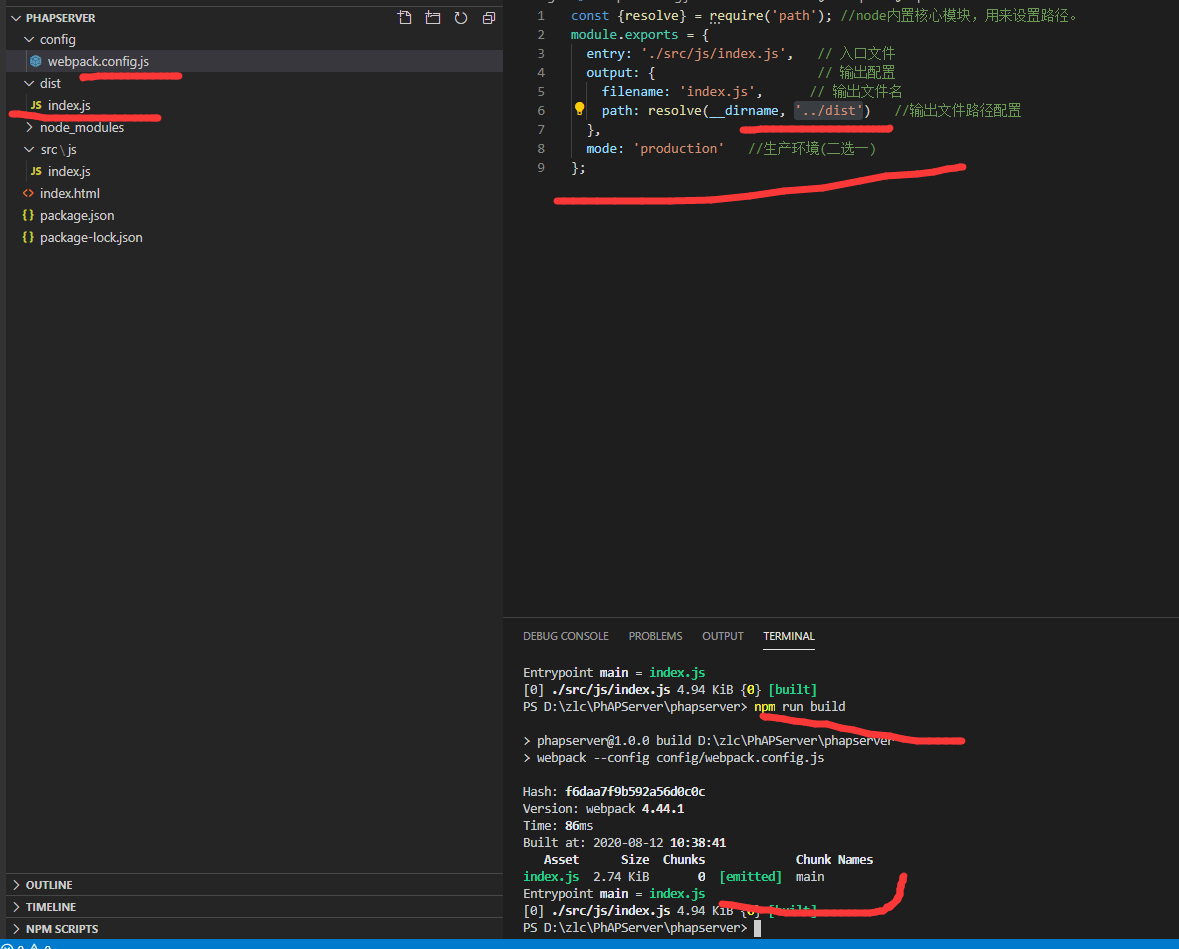 在package.json文件的scripts对象中,添加build脚本,如下,其中的config/webpack.config.js是你自己的webpack.config.js文件的路径和名称。