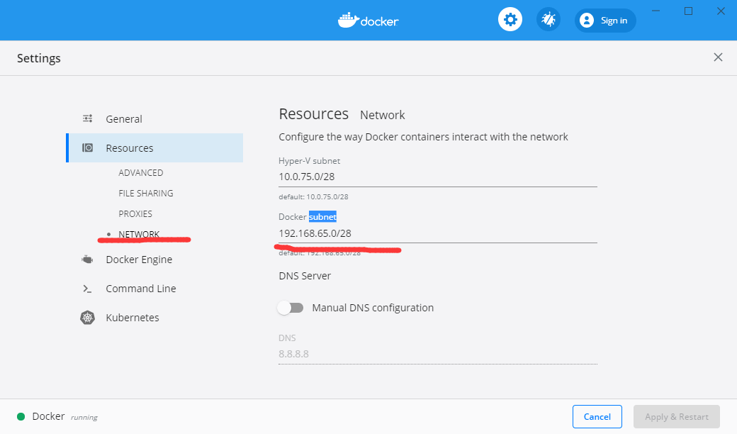 (2) 可以看到Docker中的网络是以172.17.0.0为前缀的。参考文章中提到了一个Docker Quickstart Terminal 工具,启动这个工具就可以查看docker的IP,但是我没有找到这个工具。右键右小角小鲸鱼图标,然后打开setting->Resources->Network,可以看到这里有个Docker subnet网络,那就当成docker的IP进行处理试试。