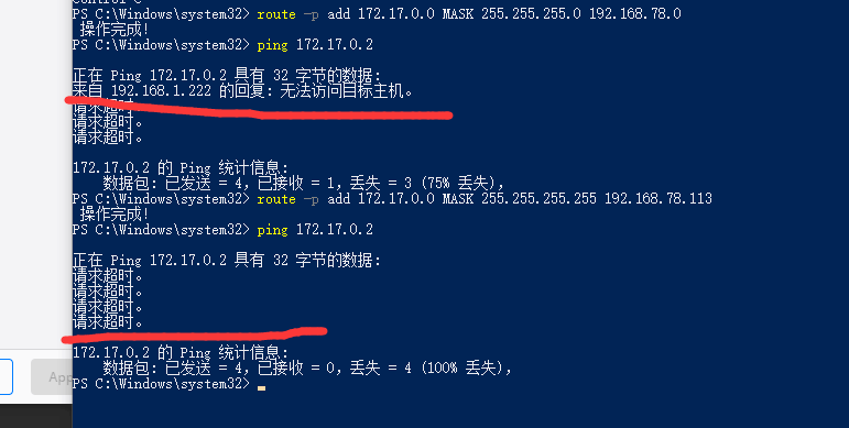 使用ping进行测试,结果不行。在多次增加路由和删除路由的过程中,我发现了一个奇怪的现象,有些直接返回的是请求超时,有的返回的是无法访问主机。是不是因为linux防火墙或者docker防火墙的原因呢?还有一个奇怪的地方,就是在docker的虚拟机centos中可以ping通windows主机,也可以ping通windows主机所在的网关。而反过来就不行。