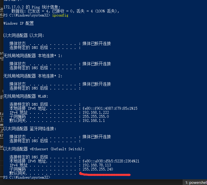 (5) 继续尝试,通过参考资料,虽然界面不太一样,但是基本上都是一个样的操作,首先windows上ipconfig,查看vEthernet的ip地址;然后设置Docker的NetWork,为这个ip;最后使用route为windows添加路由。有一点不同的是,别人的vEthernet的ip地址都是10.0.75.1,而我的是192.168.78.113