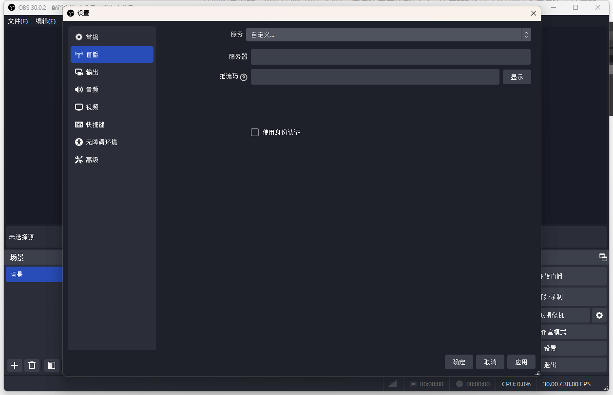 打开 OBS Stadio 进行推流。打开 文件 -> 设置 -> 直播,选择自定义,填写服务器地址,rtmp://xxxx:10009/live