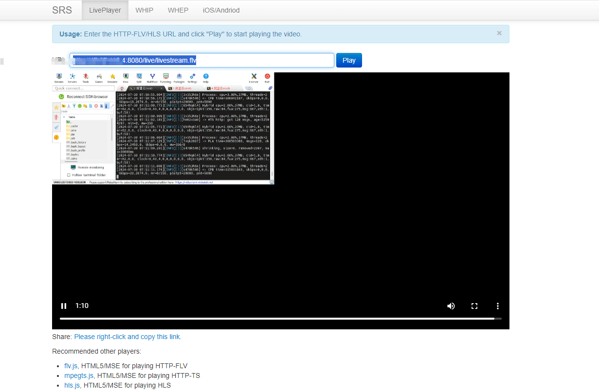 (3)打开 http://xx.xx.xx.xx:8080/players/srs_player.html 页面,在 LivePlayer 选项卡中,URL地址栏中中输入 :http://xx.xx.xx.xx:8080/live/livestream.flv 测试直播画面。