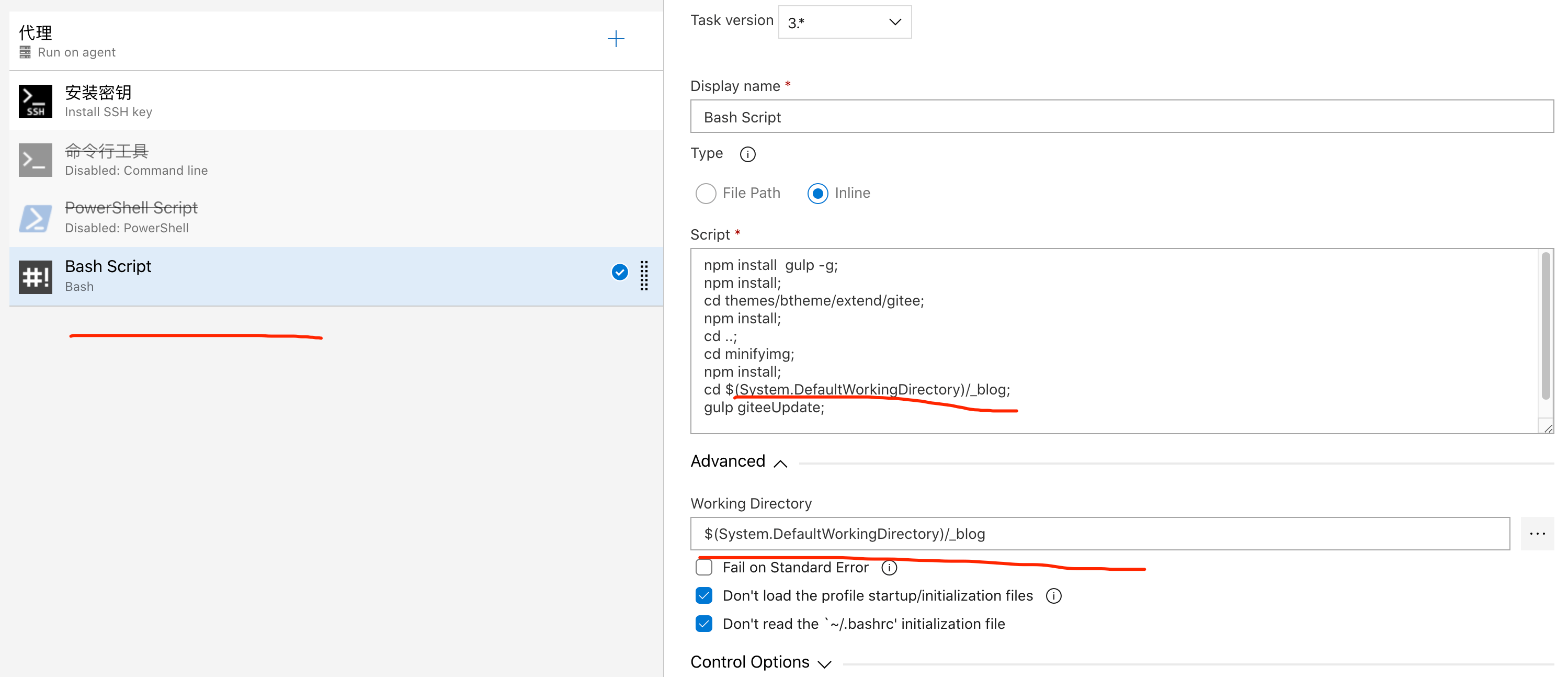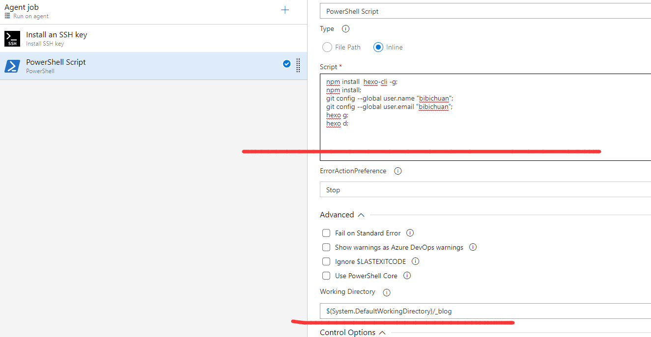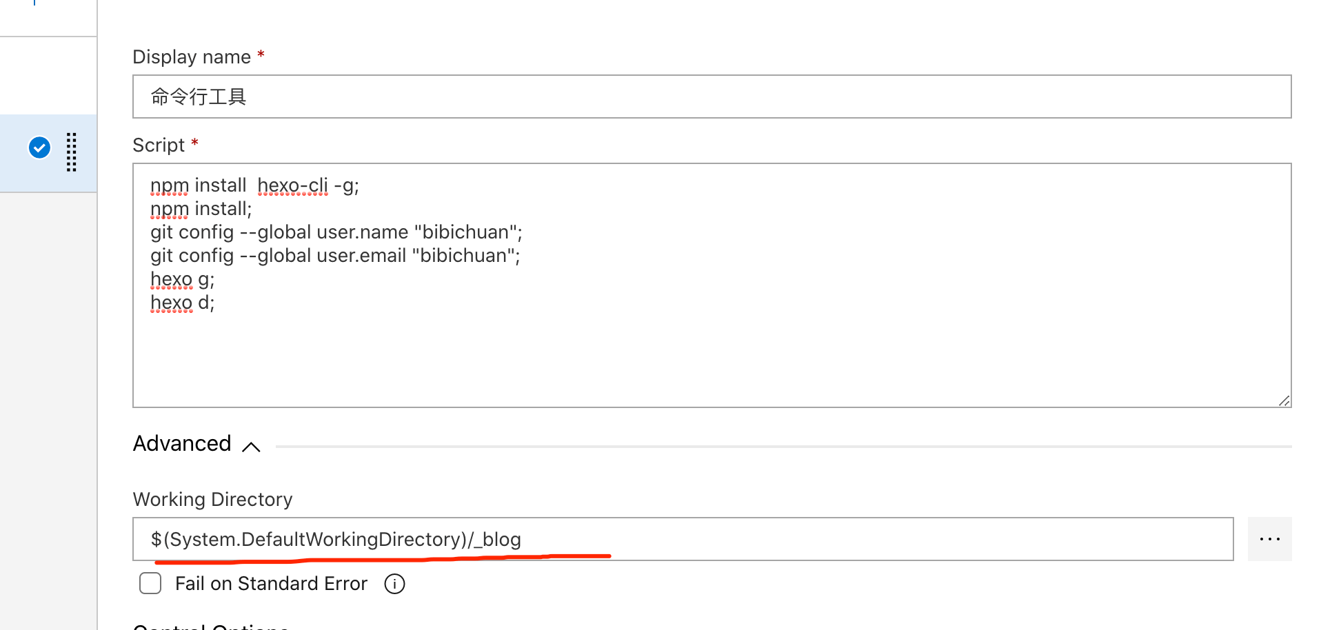 (3) 在使用命令行的时候,也可以使用变量,比如上面的:cd $(System.DefaultWorkingDirectory)/_blog; 就是进入工作目录,其中System.DefaultWorkingDirectory就代表了系统工作目录。 使用系统环境变量的时候,还是要查查手册,到底如何引用环境变量。