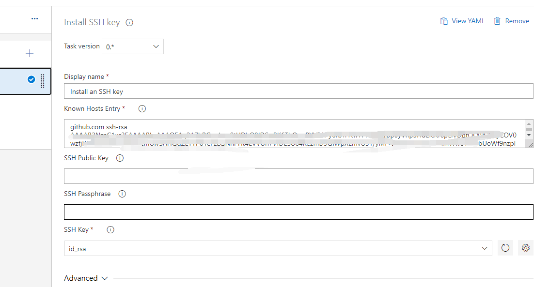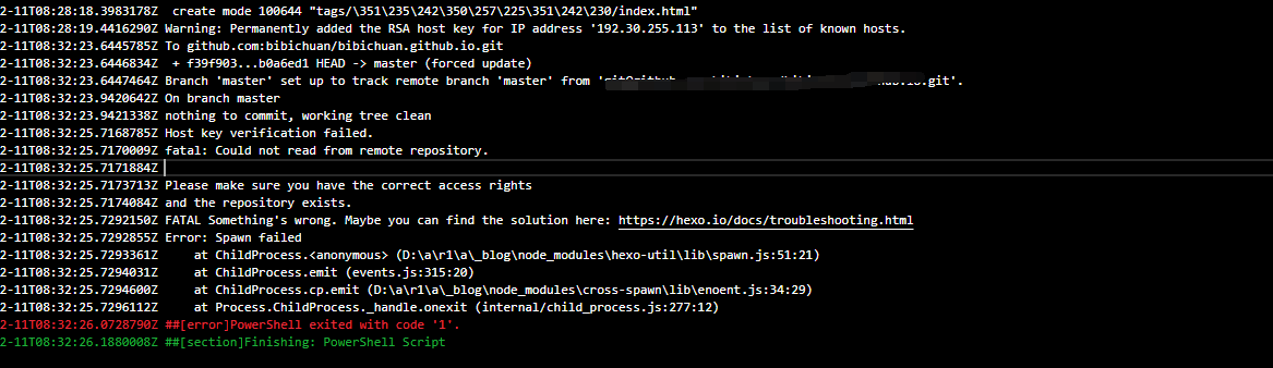 还有就是虽然最后显示的命令行执行失败,但是实际上是执行部署成功了,这一点确实让我很是不解问题找到了,其实是因为我同时部署了gitee和github,但是只是安装了github的ssh密钥,但是没有针对gitee进行密钥配置,也就是写gitee的Known Hosts Entry,所以才会导致能部署到github,但是部署不到gitee。又因为AzuerDevops执行命令行的时候,一步出错了,那么就不会执行下一步了,同时会显示错误。也可以尝试使用参考文章1中的方法进行配置使用ssh-keyscan直接将内容输出到known_hosts中