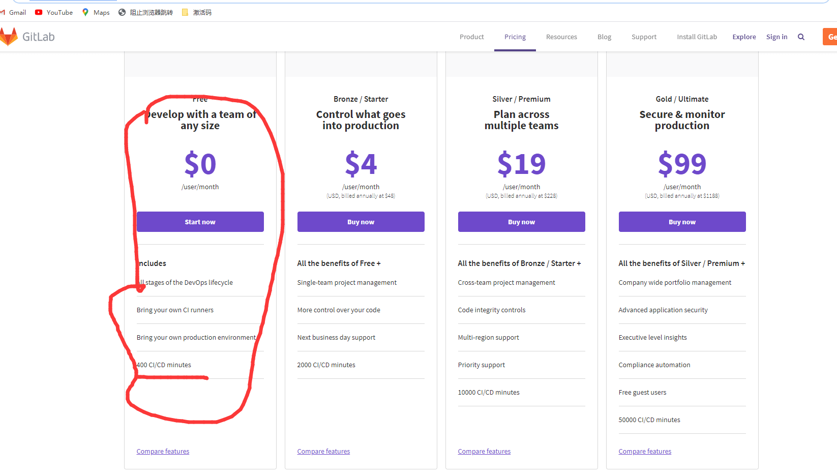 GitLab也提供CI/CD命令,但是官网价格说明中显示,免费的CI/CD,只有400分钟。