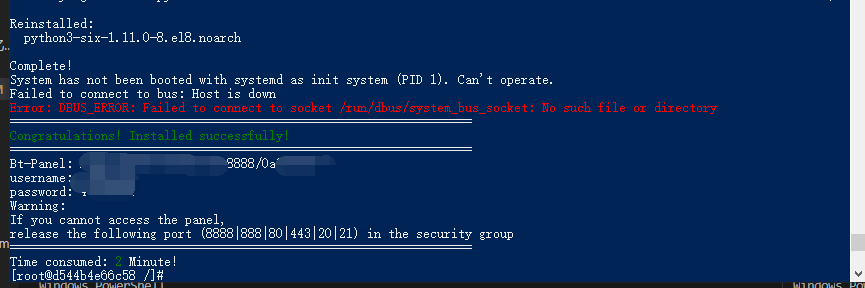 1 | ## 上面命令的意思是创建一个docker容易命名为baota(名称大家自定义)让他后台运行,然后将宿主机的20,21,80,443,888,8888这五个端口映射到docker容器中去。并且将宿主机的/home/www文件夹映射到docker容器的/www上去(注意:文件目录如果不存在。宿主机和容器会自己创建,无需手动创建)。privileged表示在运行容器的时候,给容器加特权,设置容器有写文件的权限。 |