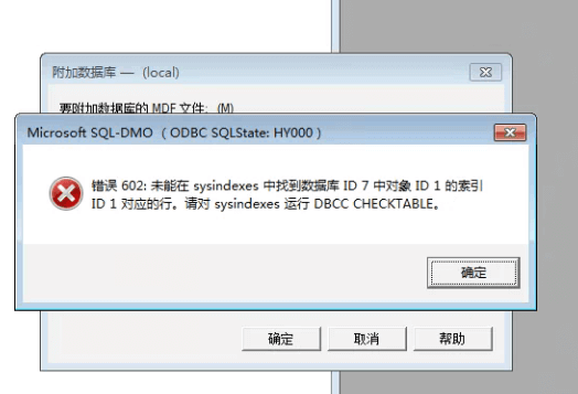 2.错误 602:未能在 sysindexes 中找到数据库 ID 7中对象 ID 1的索引 ID 1 对应的行。请对sysindexes 运行 DBCC CHECKTABLE 这里使用的是创建数据库,然后覆盖文件,最后通过命令行修复数据库文件的方式