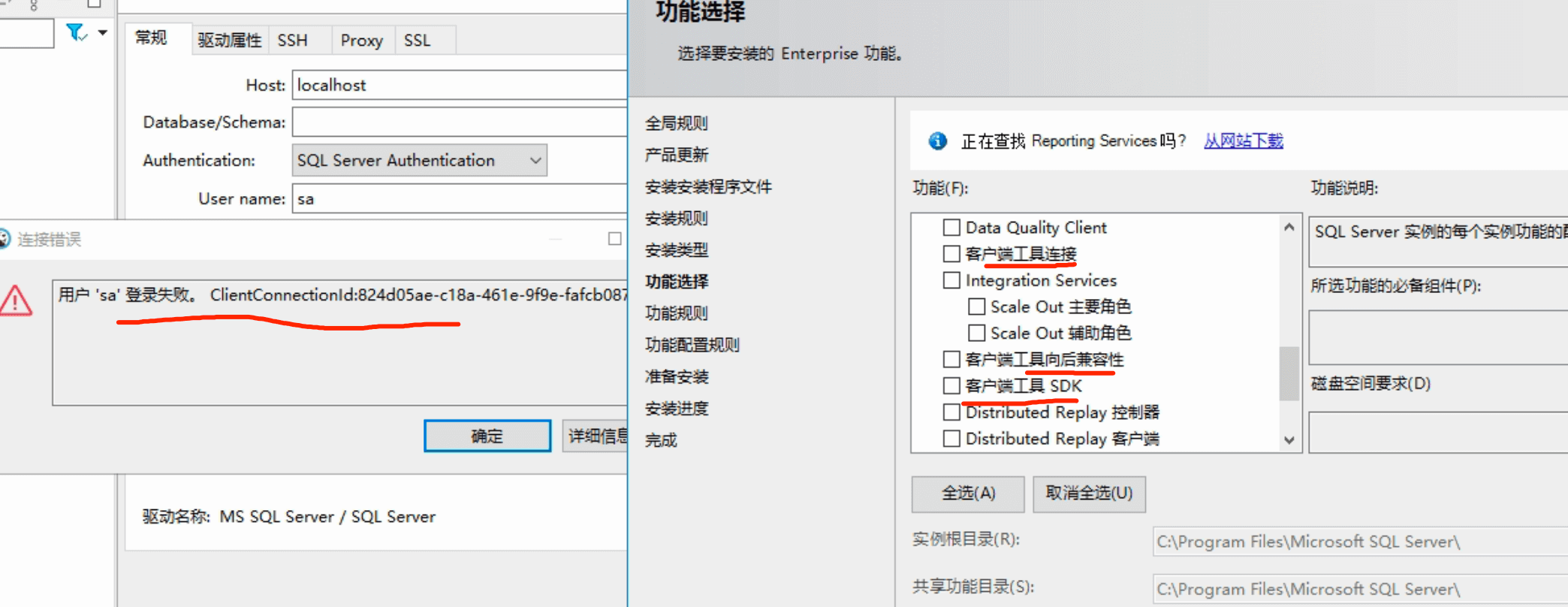 后来我想到了,会不会是我在安装sql server的时候时候,有些东西没有安装呢?有机会尝试一下。还有一个奇怪的地方,就是我使用Navicat进行127.0.0.1进行数据库连接的时候,是没有问题的,可以正常的连接,但是我使用自己写的程序(老板写的)进行连接的时候,死活都连接不上,于是我就猜测,会不会是安装的时候没有选择连接工具,因为我安装的时候,只选择了最基本的安装,并没有安装其他的工具。
