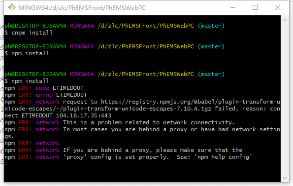 最后通过使用:npm config set registry https://registry.npm.taobao.org ,代替了cnmp命令,似乎是暂时解决了问题。