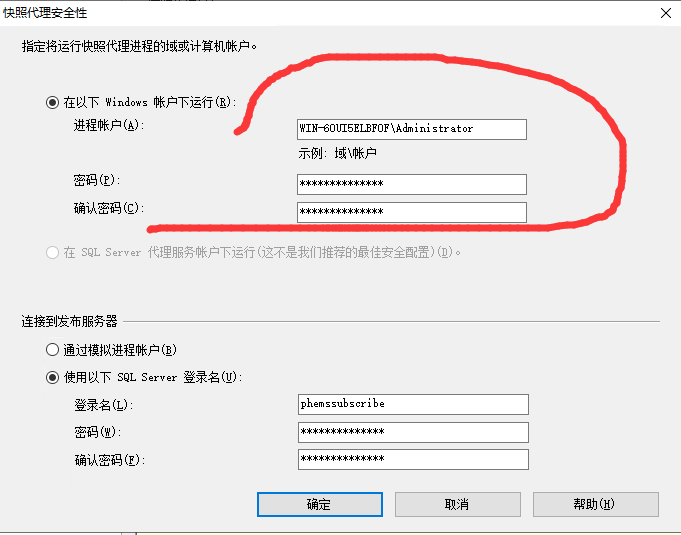 我在设置代理的安全性的时候,将“在SQL Server代理账户下运行” 改为了 “在以下windows账户下运行”,进程账户填写本机(也就是发布服务器)的用户名和密码。