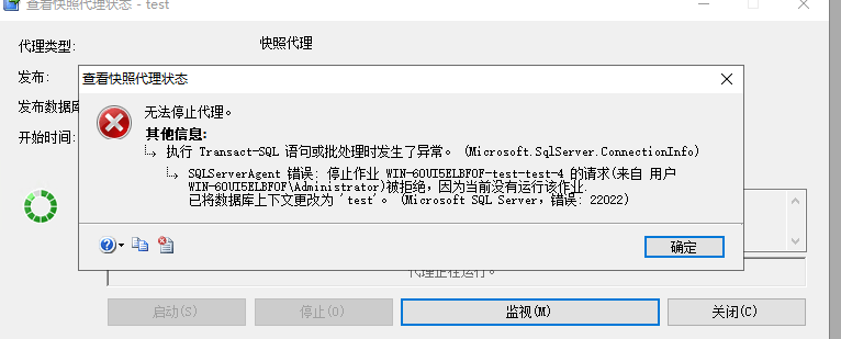 (1) 当我创建了同名的用户密码之后,使用这个进行登录,而不是administrator,导致了代理无法启动,也无法停止。”WIN-6OUI5ELBFOF-test-test-4 的请求被拒绝,因为当前没有运行该作业.”,十分钟之后,出现了:“复制代理在 10 分钟内没有记录任何进度消息。这表明代理已停止响应或系统活动过多。请确保正在将记录复制到目标,并且与订阅服务器、发布服务器和分发服务器的连接仍然是活动的。”