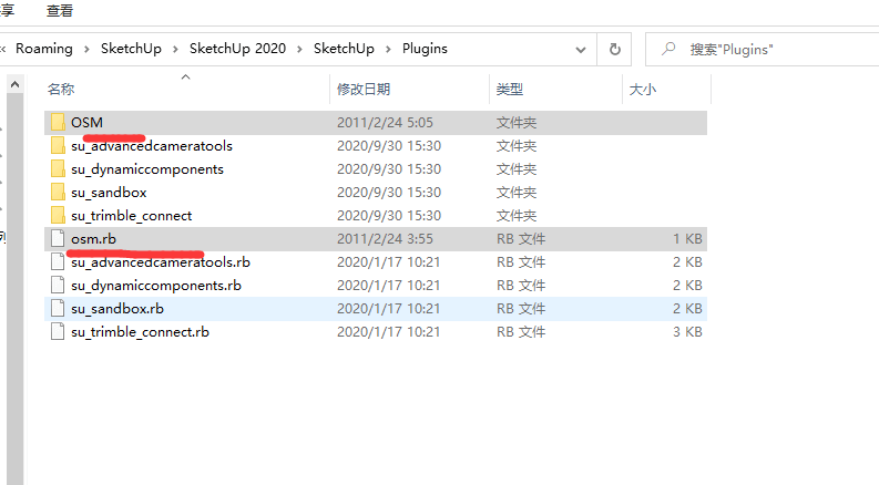 (2) 解压后,将OSM文件夹和osm.rb文件,复制到C:\Users[用户名]\AppData\Roaming\SketchUp\SketchUp 2020\SketchUp\Plugins文件夹下