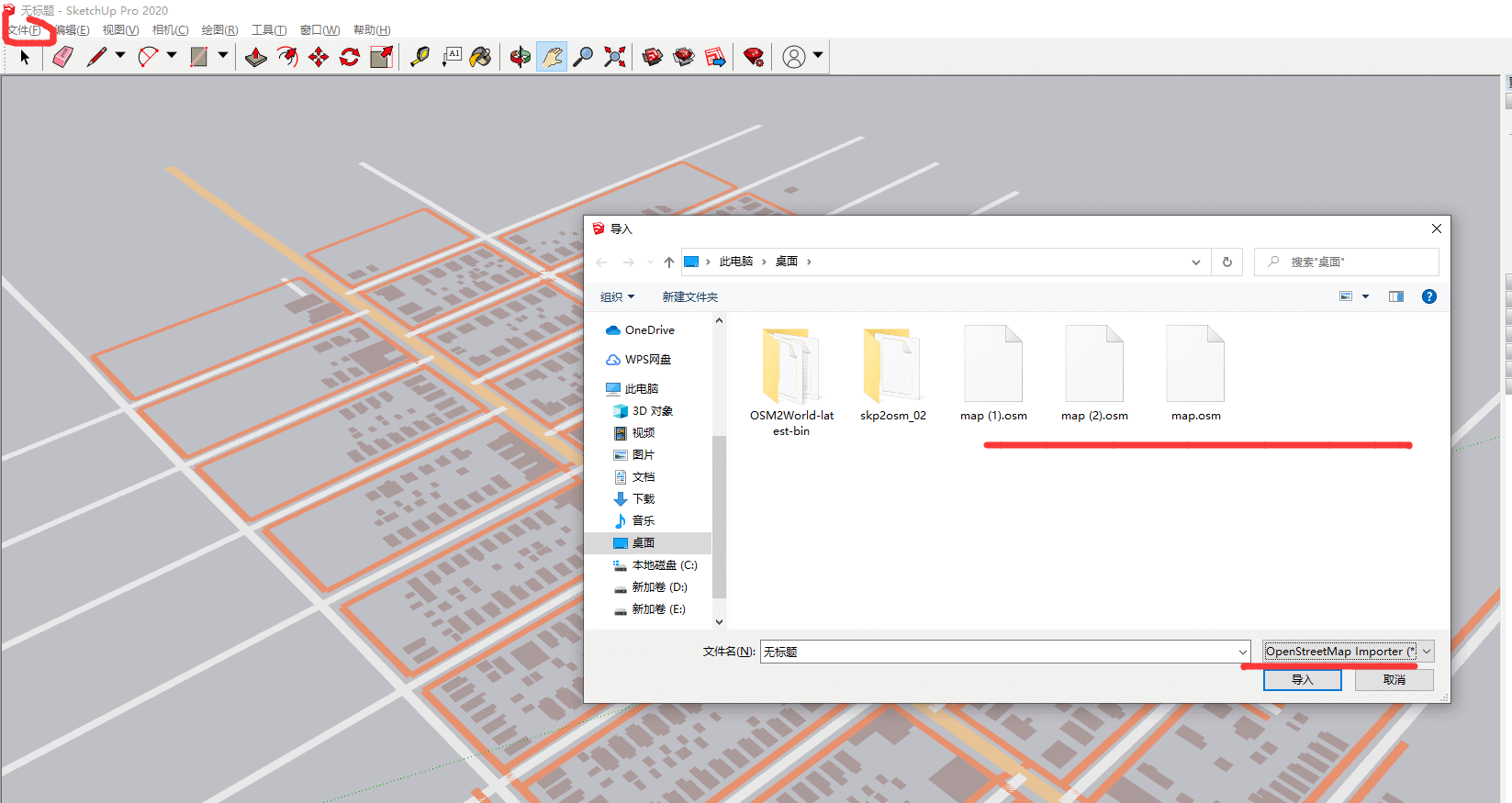 (3) 打开Sketchup软件,选择File->Import,可以选择导入osm数据