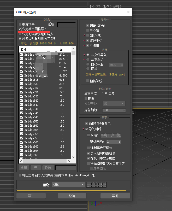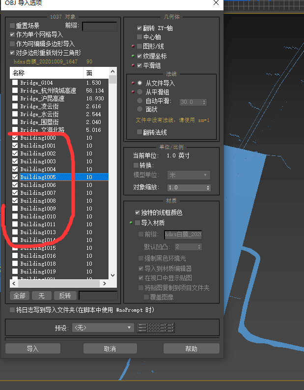 (3) 在3dmax中导入上一步的obj,需要作为单个网格导入,并选择需要导入的建筑物模型,把不需要导入的部分忽略