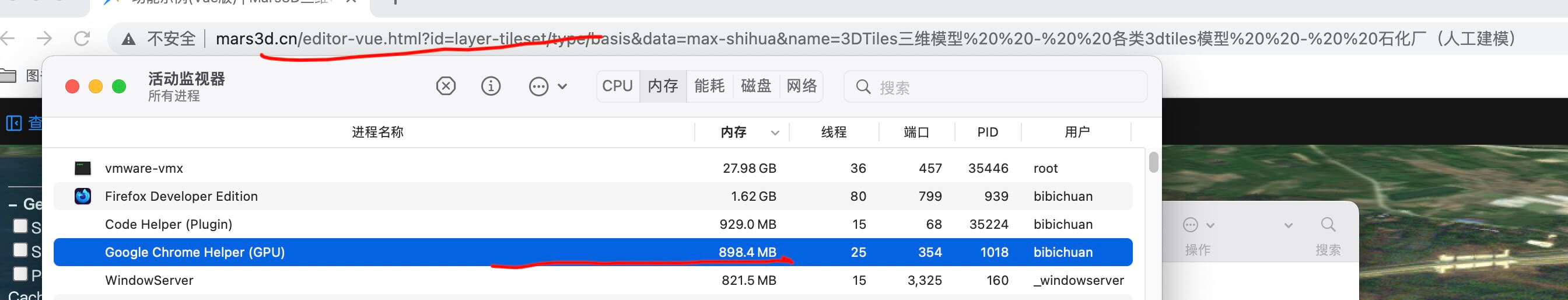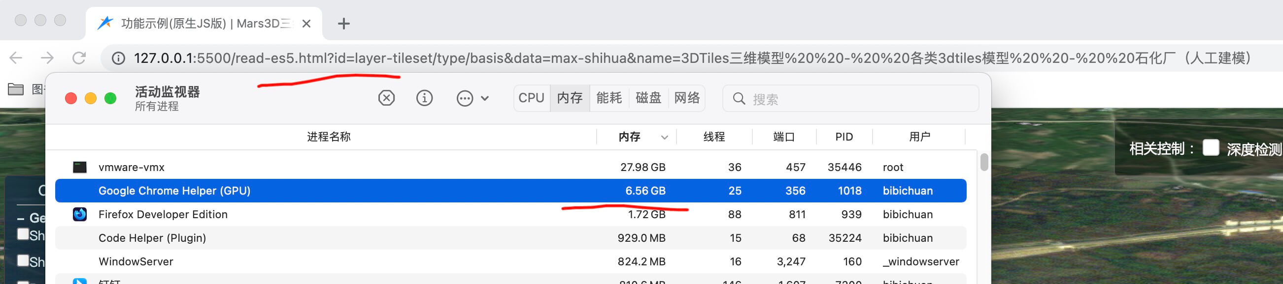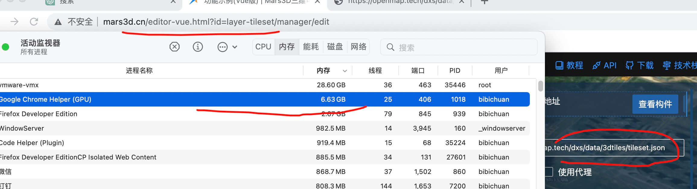 我用Mars3d开发的时候,加载了一个官方提供的石化工厂的3dtiles模型,在官方在线例子中,查看的时候,无论如何都不会出现内存占用过大的问题,但是在我本地开发的时候,却出现了在谷歌浏览器中加载这个模型,内存占用率就超过了6.5G,导致电脑一直都在疯狂的转圈,甚至导致系统卡顿了。于是我尝试使用了多种方式进行问题的排查,希望能找出问题的根本原因。这个问题让我很头大,就是我使用了官方提供的一个vue3版本的模版,我什么都没有做,只是加载了一个3dtiles模型,内存竟然表甥到了6G,我分别尝试了使用官方在线例子,官方的Vue版本,和官方的es5版本分别的内存占用,打开相关链接之后,什么都不动的情况下,在一到两分钟之后,结果只有官方在线例子不会出现问题,其他的都会达到6G的内存占用。