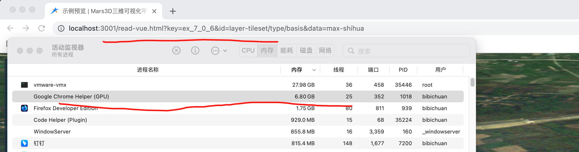 3.Mars3D开发版(Vue、ES),以及原生的Cesium内存占用都非常的高,达到了6.5G。