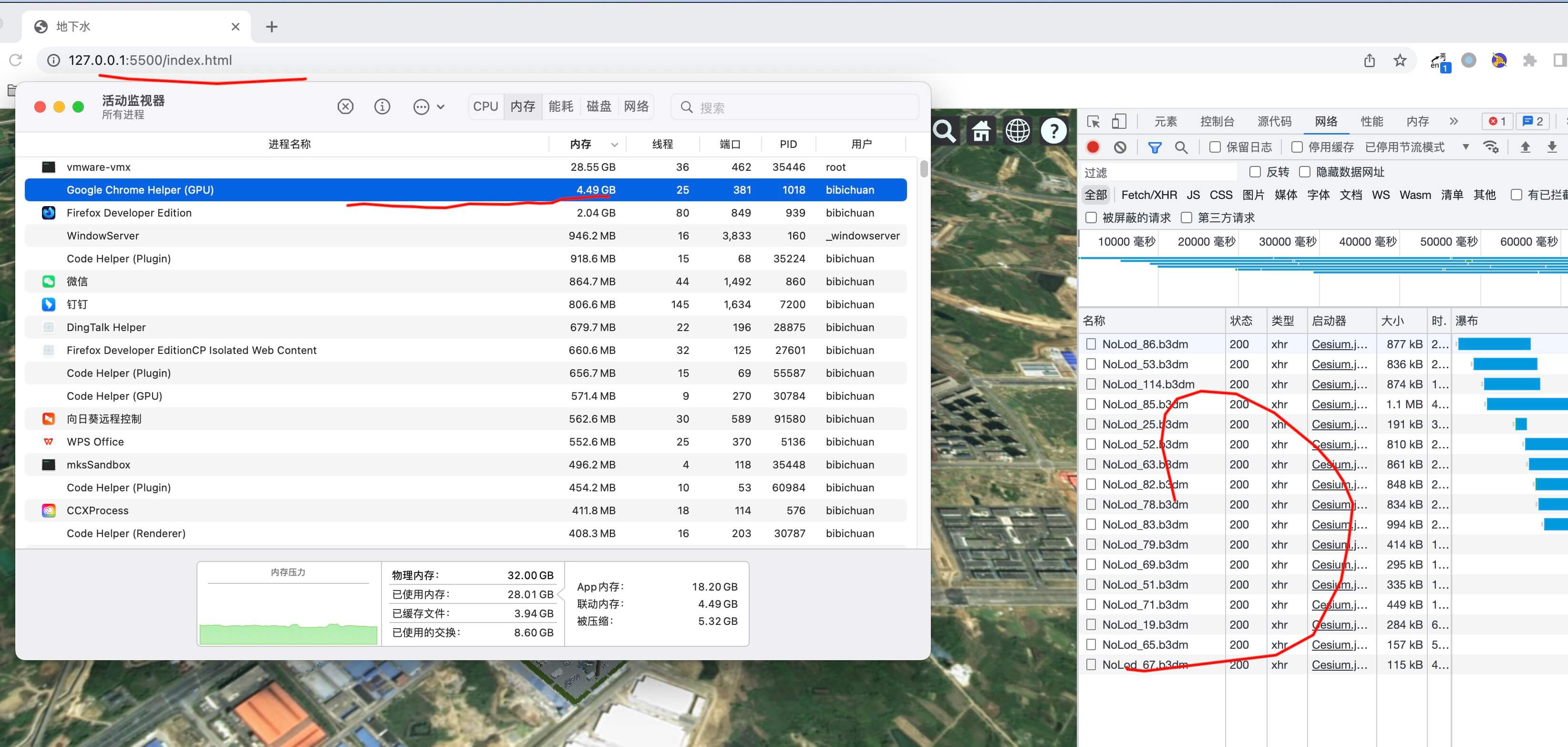 (2) 将模型下载到本地进行加载,修改上述地址,同样出现内存占用过大问题,下载到本地的3dtiles总共的文件只有80M。