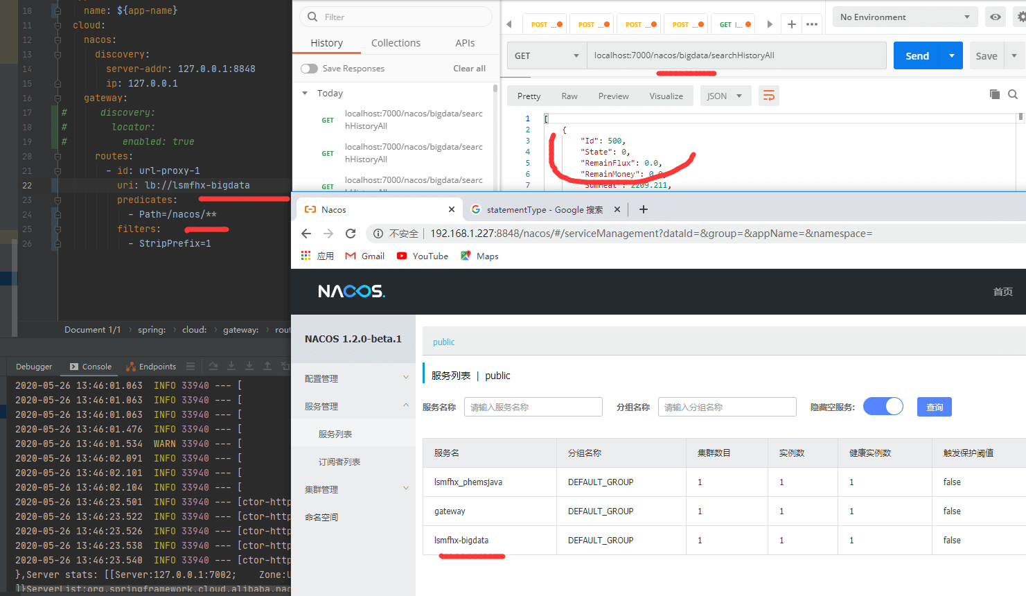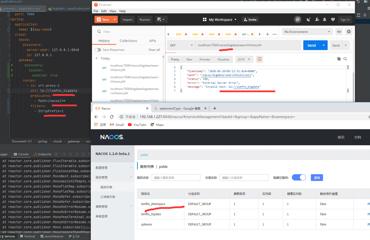 (1) 经过测试和分析,nacos中的服务名不能包含下划线,否则就会出现:Invalid host: lb://lsmfhx_bigdata 错误。