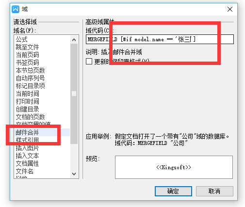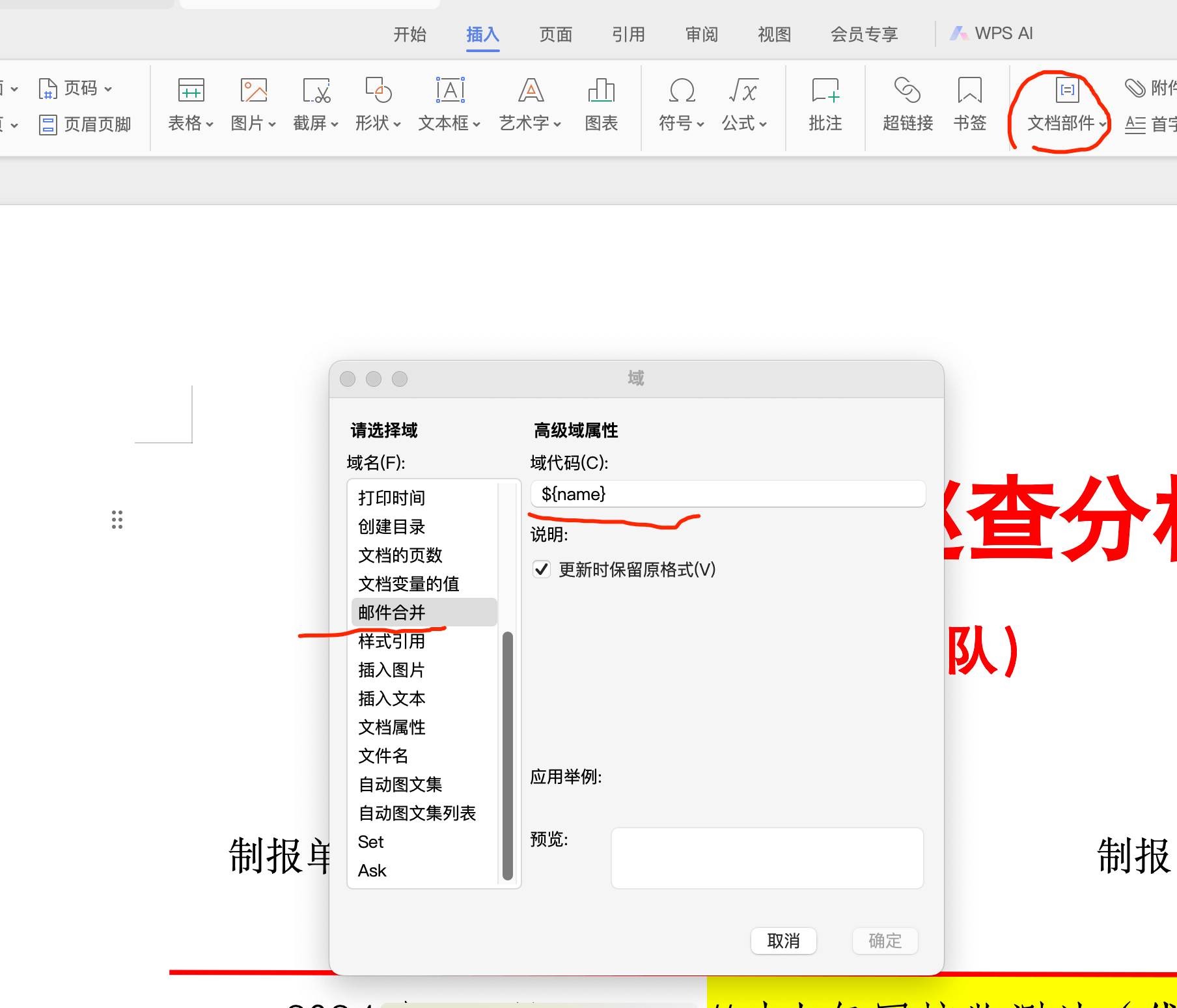首先需要准备模版,在 wps 中,依次点击 插入”—“文档部件”—“域”,选择 “邮件合并”,即可。刚开始我插入域的时候,遇到了 “错误!未指定书签”,这玩意用 wps,用 wrod编辑都是一样的,问题还不好找,我修改了域名称,结果无法确定了。