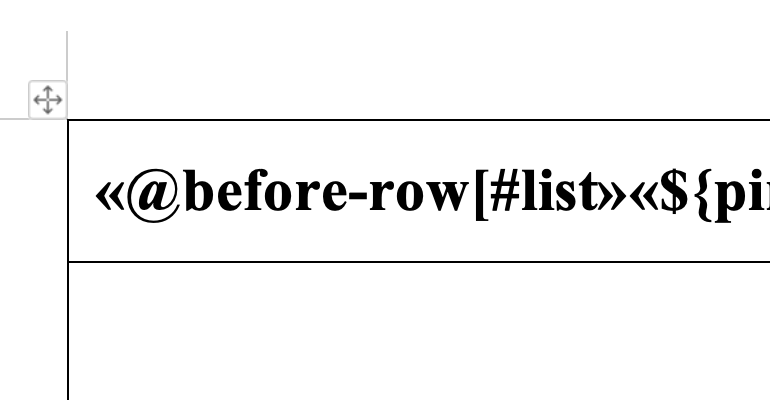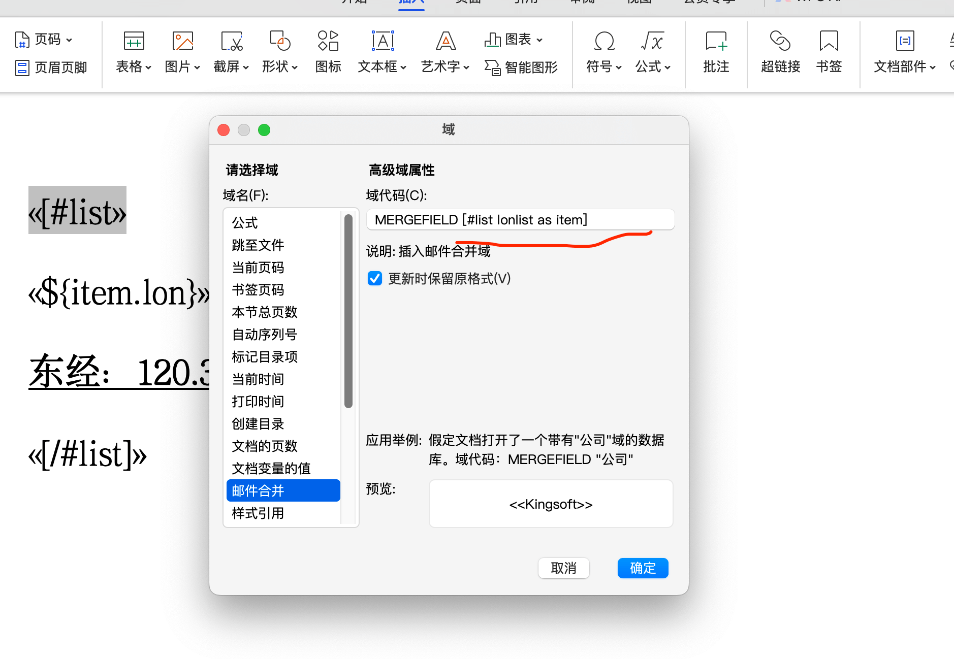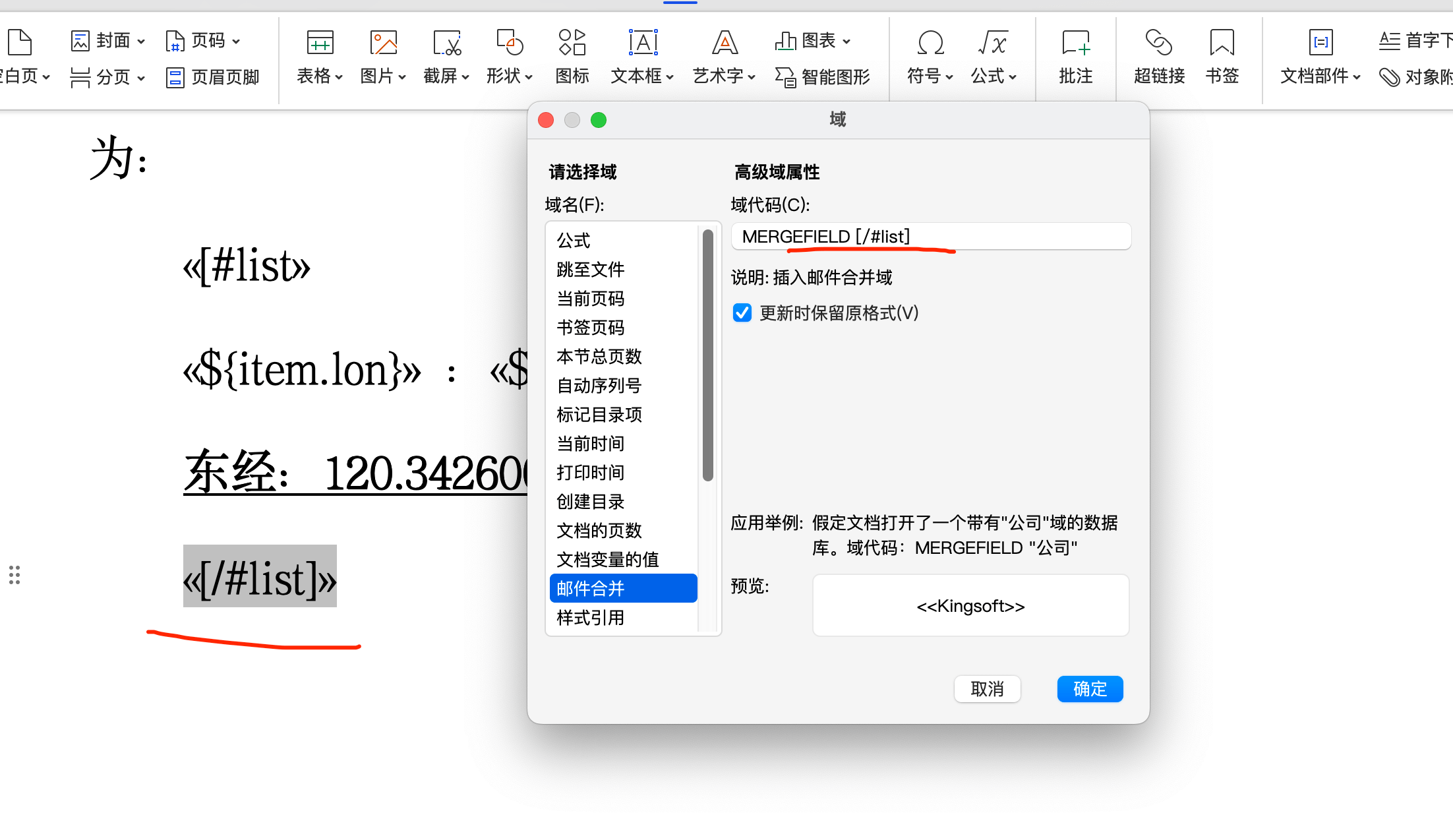 (1) 编辑模版,插入域,编辑列表头: MERGEFIELD [#list lonlist as item]