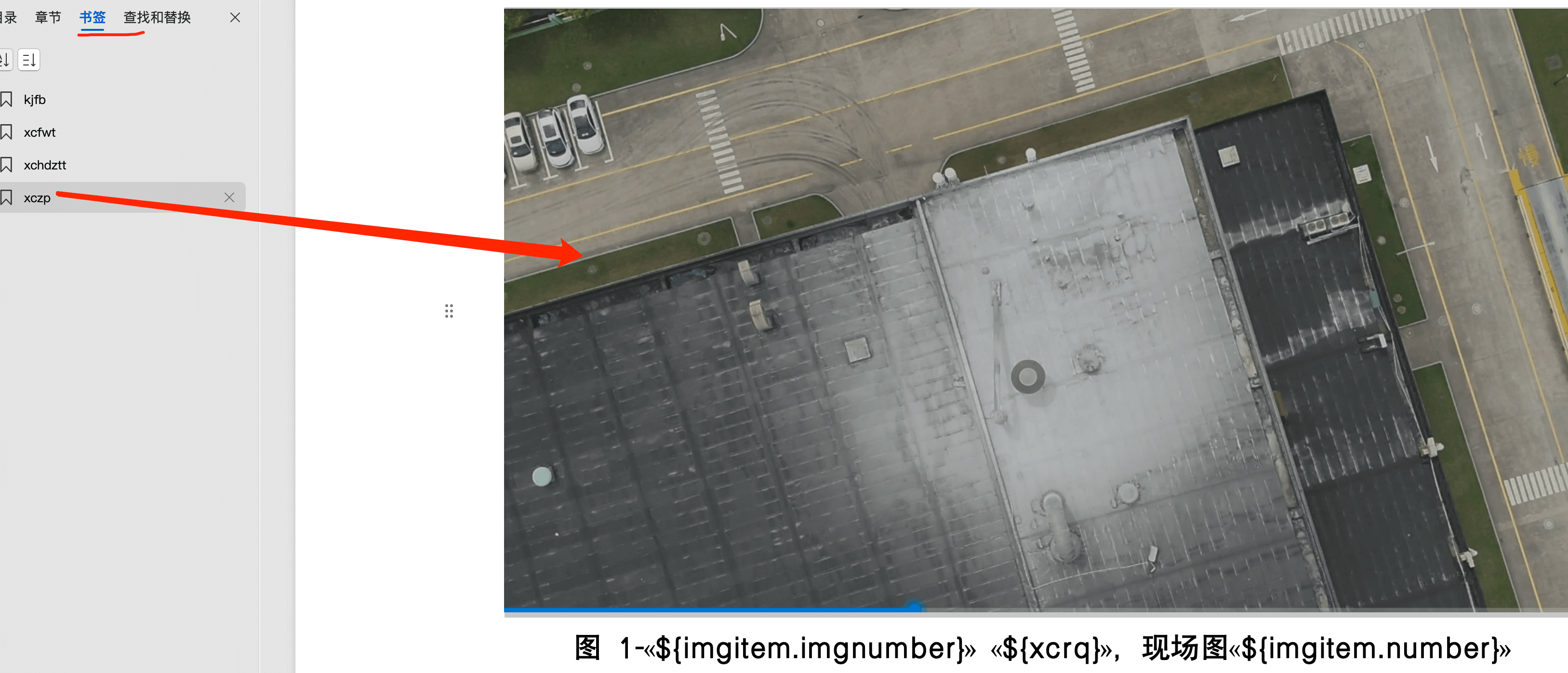 (1) 首先编辑模版,在模版中插入一张占位图,然后选中图片,选择 “插入” -> 选择 “书签”,插入一张书签,不需要加入 $ 符号。