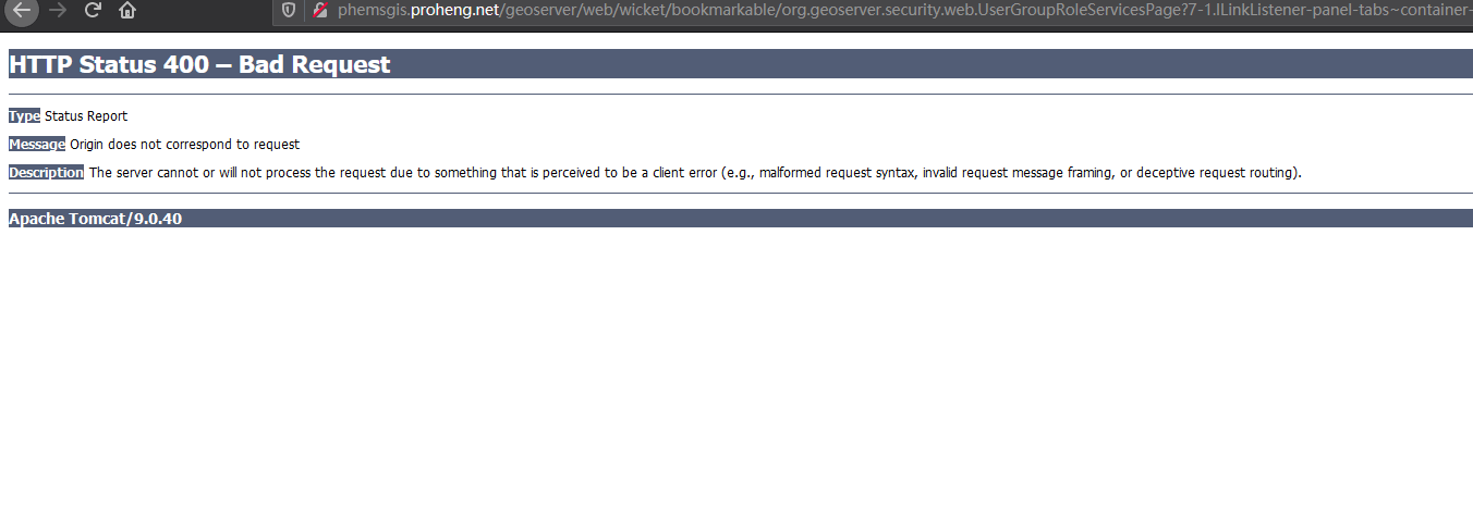 The GeoServer web admin employs a CSRF (Cross-Site Request Forgery) protection filter that will block any form submissions that didn’t appear to originate from GeoServer. This can sometimes cause problems for certain proxy configurations.