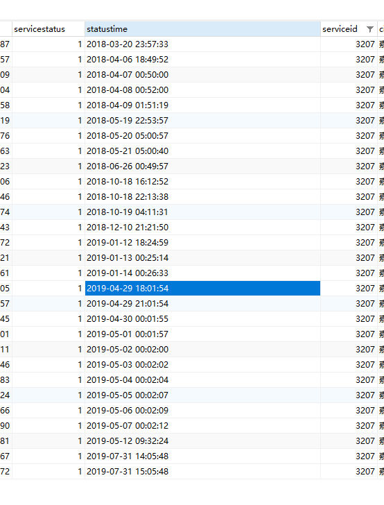 里面的?1,?2,?3…这些是为了java spring boot传递参数预留的。上面的大致的意思是,先根据wehere条件进行了筛选,然后根据serviceid进行了分组,最后在各个分组中挑选出符合条件的一系列数据行,组成最后的结果集展示出来。
