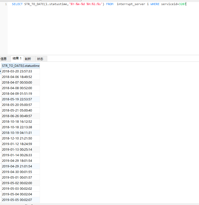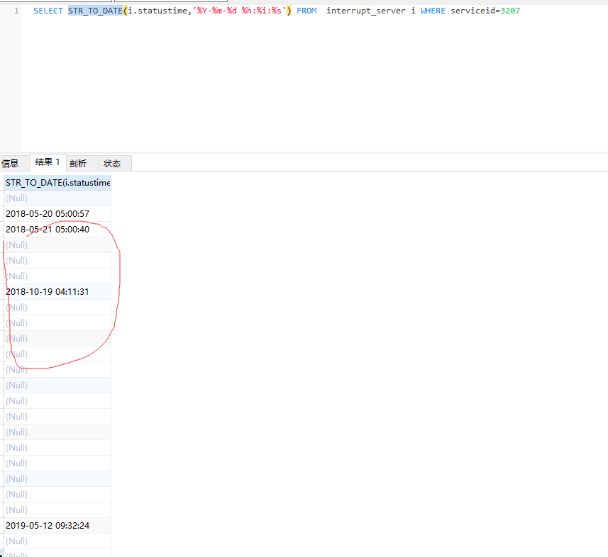 经过仔细的比对,可以发现,当小时数小于12的时候,是可以转换成功的,但是没有一个18这种小时数被转换成功的,所以,猜测,应该是使用:STR_TO_DATE(i.statustime,’%Y-%m-%d %h:%i:%s’),只能转换12小时格式的时间。将 %h 改为 %H ,果然就正常了。(基础知识不扎实,硬伤啊)